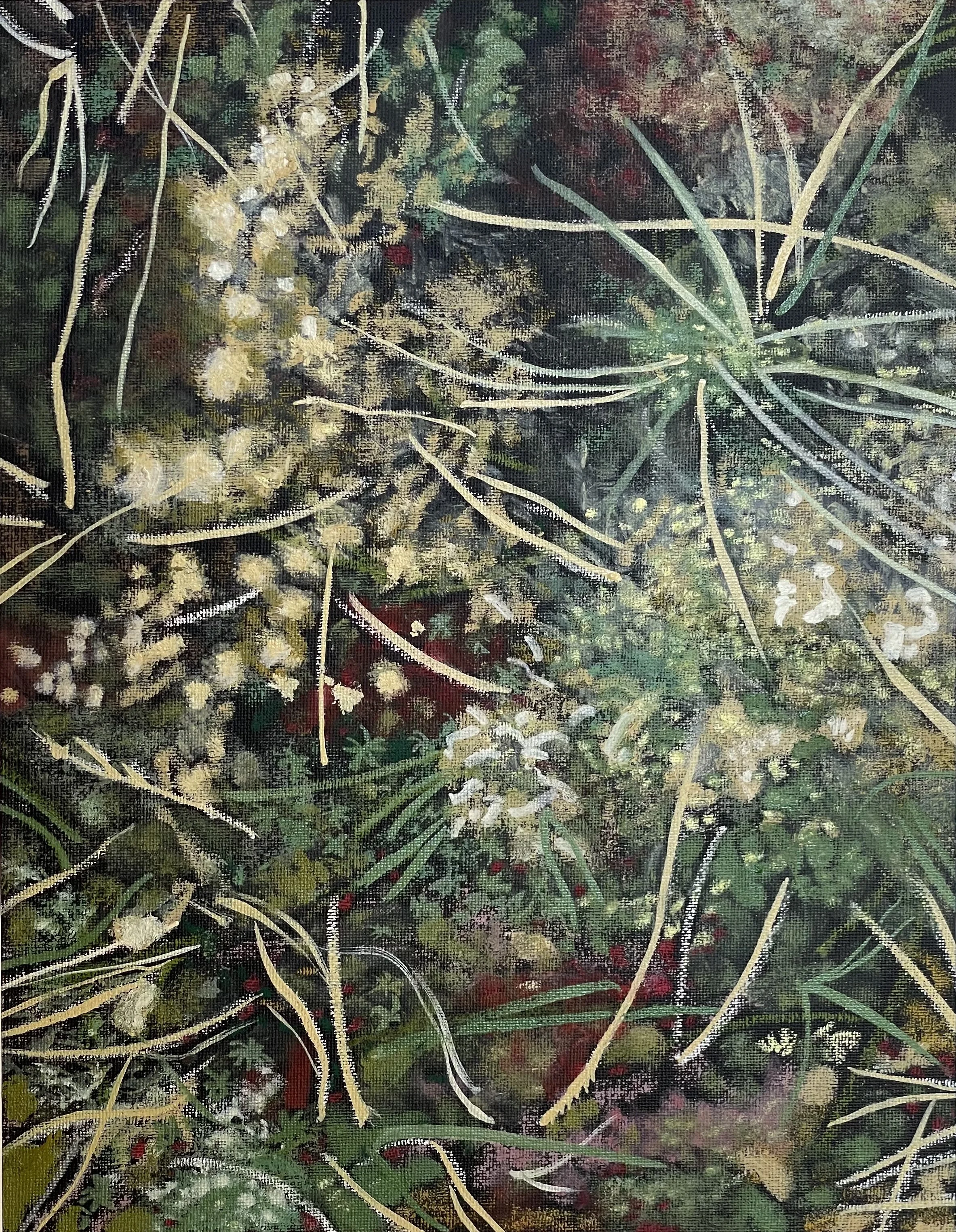 Rocky Ledge 9x12 Oil, mica, silver leaf, conte crayon on paper 2025
